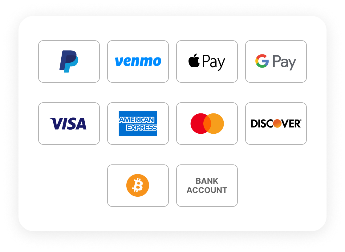 Pay with Apple Pay, Google Pay, Venmo, PayPal, credit & debit cards, and more.